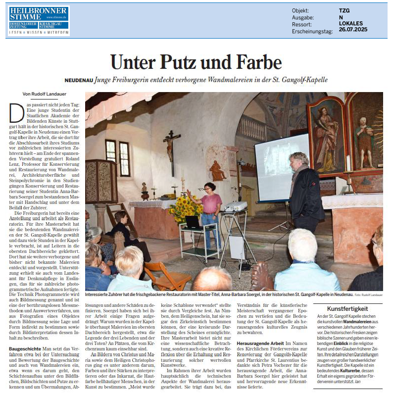 Die Gangolfskapelle in Neudenau birgt kunsthistorische Schätze, die vielen Besucher:innen bislang verborgen geblieben sind. In einem öffentlichen Vortrag stellt Frau Soergel, Masterandin der Staatlichen Akademie der Bildenden Künste Stuttgart, ihre faszinierenden Forschungsergebnisse zu einem bislang wenig bekannten Bereich der Kapelle vor: einer ehemaligen Außenwand mit über fünf Meter breiten Fresken. Die Arbeit entstand in Zusammenarbeit mit Prof. Lenz.